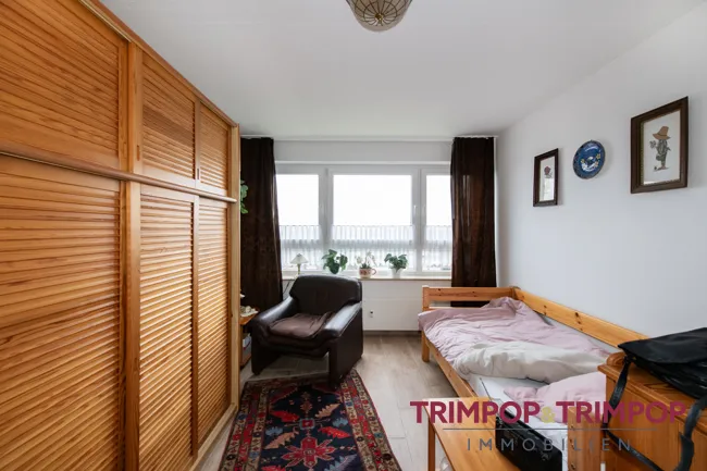 Die zwei Zimmer haben eine sehr gepflegte Ausstattung. Neben dem luftigen Wohn-/Esszimmer mit Austritt auf den nach Osten ausgerichteten Balkon inkl. Abstellkammer liegt das geräumige Schlafzimmer. Beide Räume liegen sehr ruhig zur Seite heraus mit Blick auf die Grünanlage.