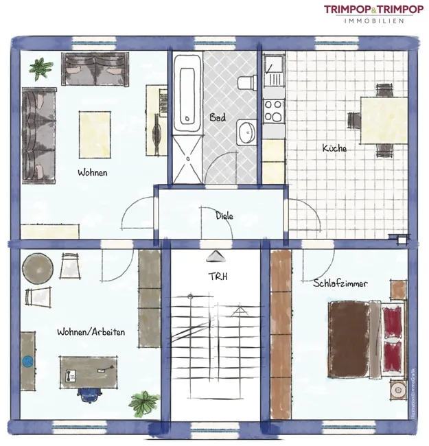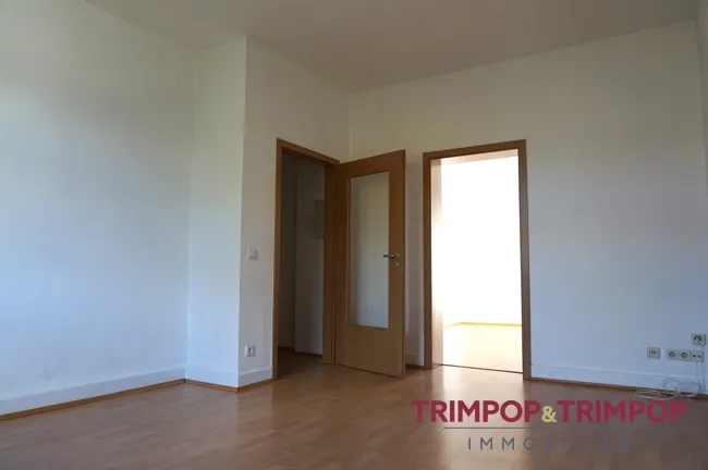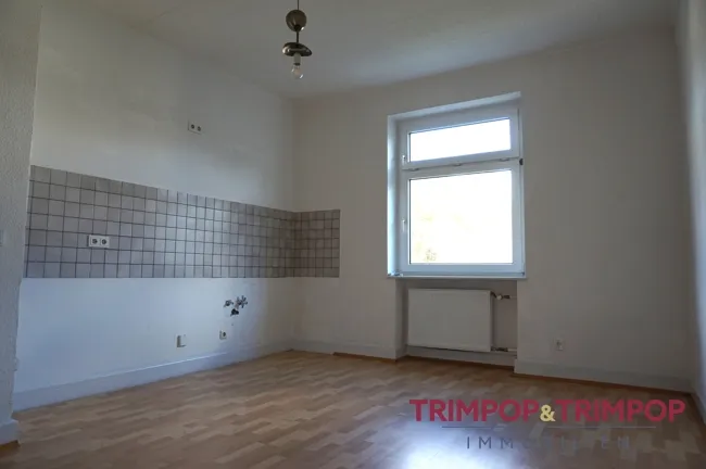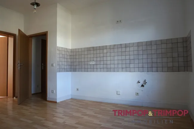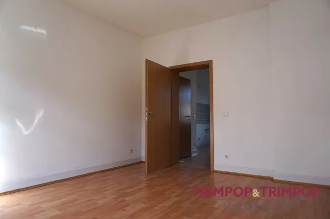 Zwei Zimmer liegen auf der linken Seite der Diele, hier könnten Sie Ihr Wohn- und ein Büro/Gästezimmer einrichten, die Küche und das dritte Zimmer, z.B. nutzbar als Schlafzimmer, liegen auf der rechten Seite des Flurs. Das Bad befindet sich gegenüber der Wohnungstüre.