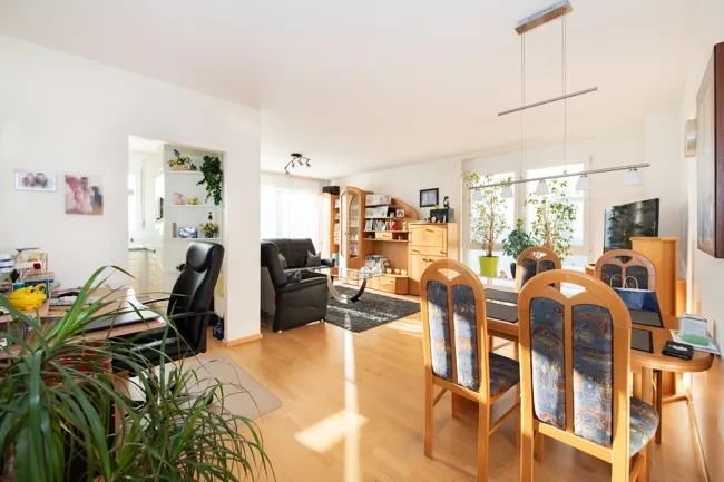 Die Wohnung ist mit einem großzügigen, hellen Wohn-Esszimmer ausgestattet, das direkt zum Balkon führt. Der hochwertige Parkettboden zieht sich – außer im Bad – durch die gesamte