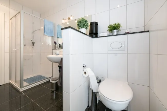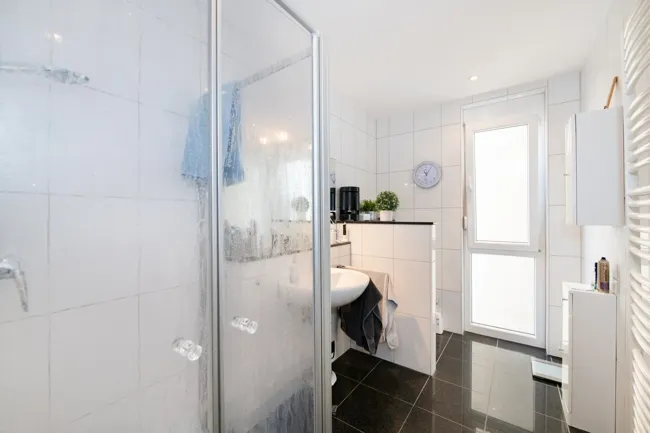 Das moderne Duschbad ist in einem sehr gepflegten Zustand und verfügt über eine optisch abgetrennte Toilette sowie eine neu installierte Handtuchheizung.