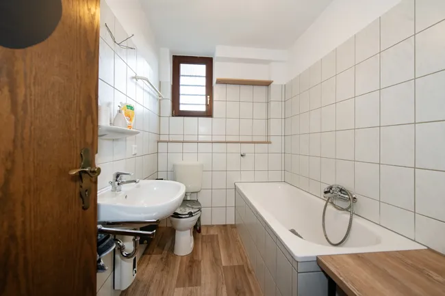 Das Badezimmer mit Fenster, ist funktional und komfortabel ausgestattet – mit Badewanne, Waschbecken und Toilette.