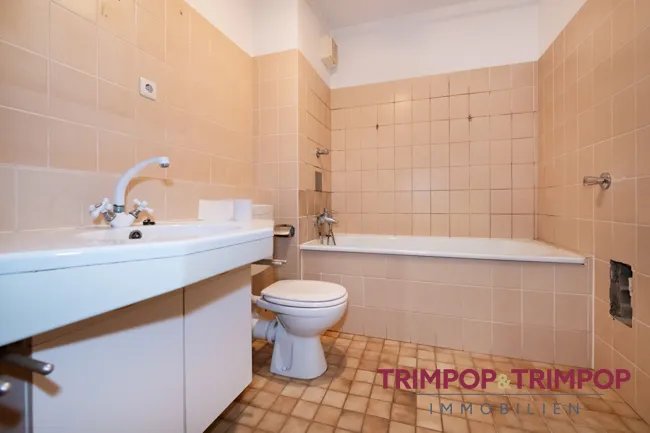 WELLNESS: Das innenliegende Bad mit Wanne, Waschbecken, WC so wie Anschluss für die Waschmaschine und den Trockner hat alles, was man fürs Wohlbefinden benötigt. Für den Besuch gibt es, wie es sich gehört, ein separates Gäste-WC. Sowohl das Bad als auch das Gäste-WC könnten eine Auffrischung benötigen.